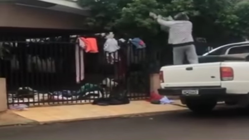 Testemunhas relataram que a mulher chegou em um carro carregado de roupas do companheiro. Em cima do veículo, ela começou a lançar peças de roupa por cima do muro, atingindo o quintal da residência, que seria da suposta amante. Camisas, calças, sapatos e até roupas íntimas ficaram espalhados pela área externa.