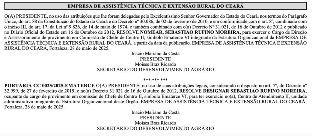 (..)Ematerce, no uso de suas atribuições legais, considerando o disposto no art. 7º, do Decreto nº 32;999. De 27 de fevereiro de 2019. E no Decreto 31.021 de 16 de outubro de 2012, resolve designar Sebastião Rufino Moreira, ocupante do cargo de provimento em comissão de Chefe de Centro II, símbolo Ematerce VI, para ter exercício no, Centro de Atendimento II. Unidade administrativa integrante da Estrutura Organizacional deste Órgão, Empresa de Assistência Técnica  e Extensão Rural do Ceará. Fortaleza, 28 de maio de 2025”. Assina o documento: Sr. Inácio Mariano da Costa (Presidente da Ematerce) e Moises Braz Ricardo (Secretário do Desenvolvimento Agrário). (Veja o documento abaixo)