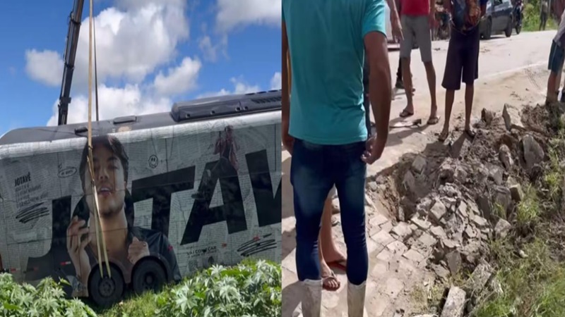 O cantor piauiense Jotave passou por momentos de tensão na tarde desta quinta-feira (26) ao se deslocar com sua banda de Canhotinho para Cupira, no interior de Pernambuco. O ônibus que transportava a equipe ficou pendurado sobre uma vala após a lateral da estrada ceder, por pouco não resultando em um acidente grave.