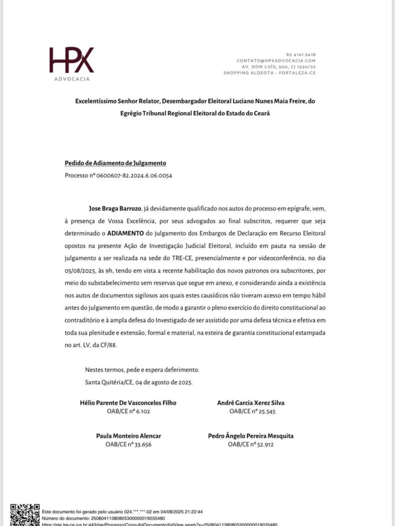 Na segunda-feira (4), a nova banca de advogados de Braguinha apresentou um pedido para adiar o julgamento, mas o relator do caso, desembargador Luciano Maia, indeferiu a solicitação.