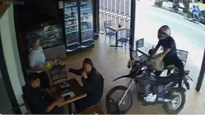 Câmeras de segurança registraram o momento em que o motociclista tentou ultrapassar a caminhonete que fazia uma conversão à esquerda. A colisão na lateral da moto fez com que ele perdesse o controle do veículo e invadisse o estabelecimento.