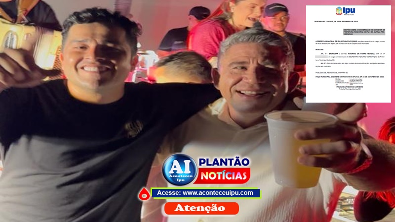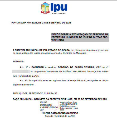 Nesta terça-feira, 23 de setembro de 2025, veio a público a Portaria nº 710/2025, que determinou a exoneração de Rodrigo de Farias Teixeira do cargo de Secretário Adjunto de Finanças da Prefeitura de Ipu, no governo da prefeita Milena Damasceno. (Veja o documento abaixo)