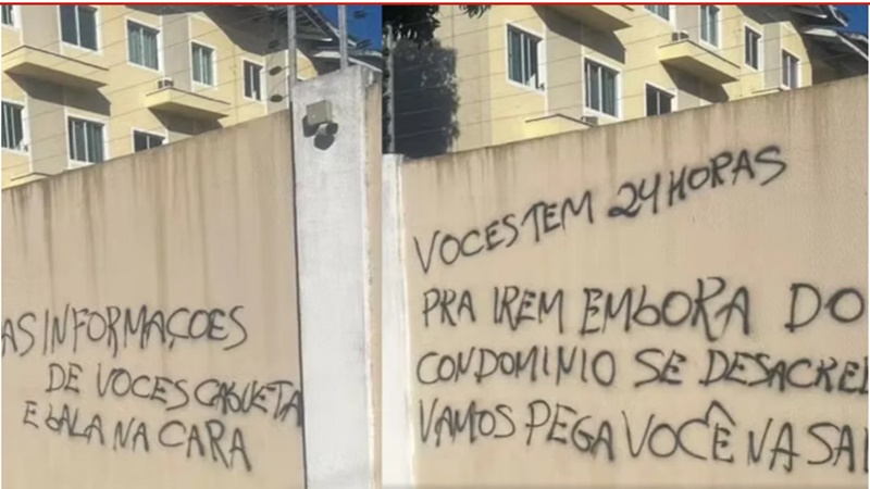 Entre as mensagens, uma delas dizia: “Vocês têm 24 horas para irem embora do condomínio, se desacreditar, vamos pegar você na saída”. Além disso, placas de veículos de ao menos três moradores foram citadas diretamente, em uma tentativa de identificar quem deveria abandonar o local.