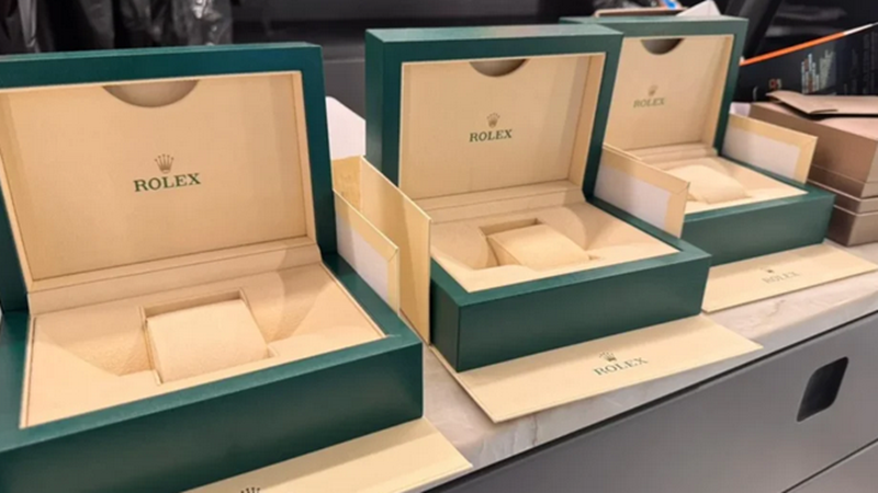 Durante as buscas, a polícia encontrou caixas vazias de relógios e joias de alto valor, incluindo marcas como Rolex.