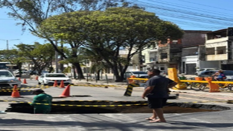 Uma cratera se abriu na manhã deste domingo, dia 14, no cruzamento da Avenida Leste-Oeste com a Rua Santa Rosa, no bairro Pirambu, em Fortaleza. O problema foi provocado pelo rompimento de uma tubulação da rede de água e esgoto, causando susto em moradores e em quem passava pela região.