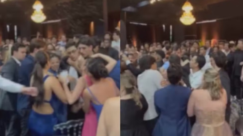 Após a intervenção, o DJ interrompeu a apresentação. A atitude causou revolta entre os formandos e convidados, que passaram a discutir com o pai do estudante. Vídeos gravados no local mostram pessoas gritando, se empurrando e tentando abrir espaço em meio às mesas e cadeiras.