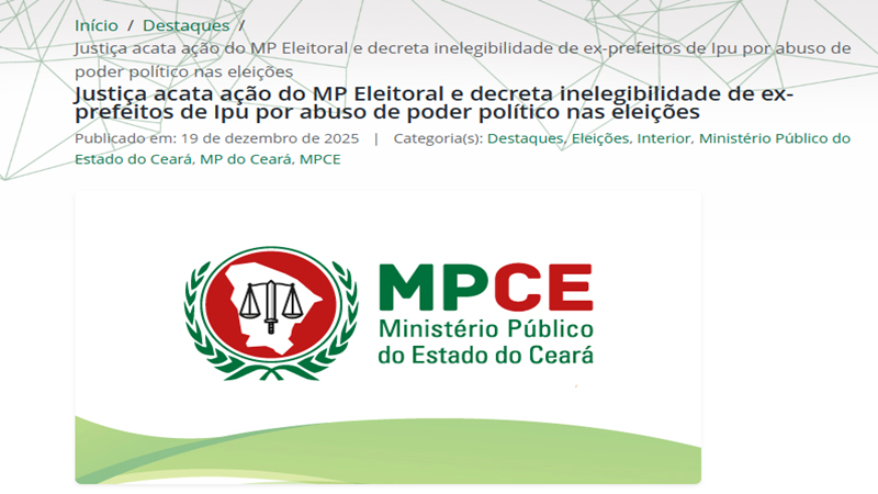 Decisão da 21ª Zona Eleitoral – A Justiça da 21ª Zona Eleitoral de Ipu acatou ação do Ministério Público Eleitoral e decretou, nesta última quinta-feira (18/12/2025), a inelegibilidade de importantes figuras políticas do município por abuso de poder político nas eleições. A decisão alcança o ex-prefeito Robério Wagner Martins Moreira, a ex-secretária de Educação Terezinha Rufino, além de Carlos Sérgio Rufino e Albertina Ribeiro, candidatos a prefeito e vice-prefeita nas últimas eleições municipais.