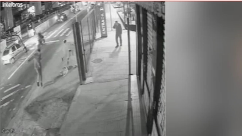 Após a intervenção, o suspeito iniciou uma briga com o segurança do estabelecimento. Durante o tumulto, o cachorro comunitário que circulava pela área começou a latir, chamando a atenção do agressor.