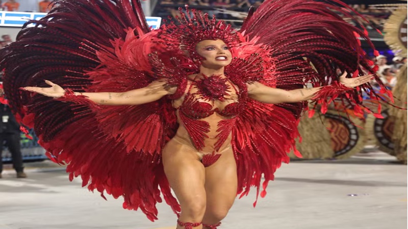 Mesmo em meio à correria, ela demonstrou entusiasmo e falou sobre a emoção de ocupar o posto à frente da bateria da Grande Rio, uma das posições mais simbólicas do Carnaval carioca.