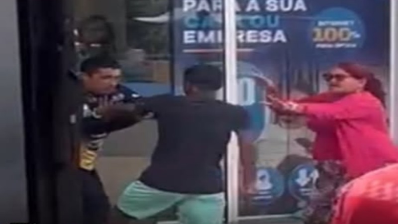 Uma mulher aparece nas gravações tentando intervir e evitar que a situação terminasse de forma ainda mais grave.