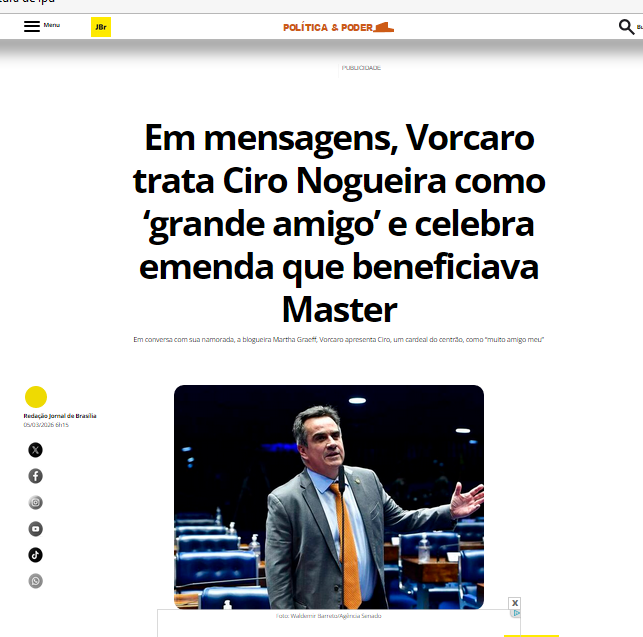O Jornal de Brasília destaca nesta quinta-feira, 05 de março de 2026, em sua manchete de capa: “Em mensagens, Vorcaro trata Ciro Nogueira como ‘grande amigo’ e celebra emenda que beneficiava Master”.