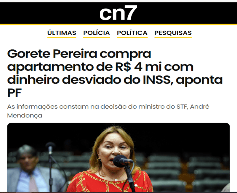 O site CN7 destaca como manchete de capa nesta quarta-feira, 18 de março de 2026, “Gorete Pereira compra apartamento de R$ 4 mi com dinheiro desviado do INSS, aponta PF”.