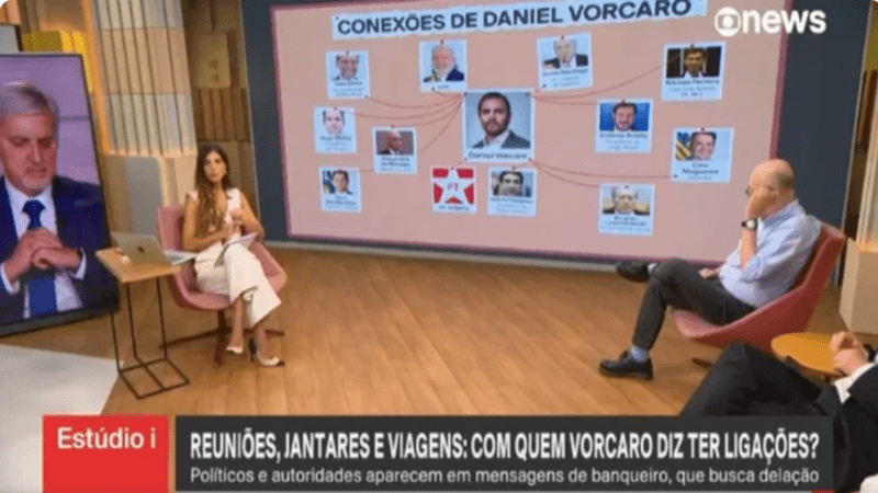 Depois de meses de cobertura do caso, a GloboNews exibiu no programa Estúdio I um quadro com os principais nomes ligados a Vorcaro. Surpreendentemente, no topo do “power point” apresentado pela jornalista Andréia Sadi apareceram Lula, Gabriel Galípolo, Guido Mantega e o PT, enquanto figuras da direita e do Centrão ficaram em segundo plano.