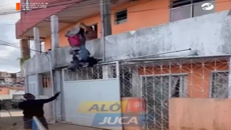 Durante a confusão, roupas e outros objetos foram lançados para fora da residência, ficando espalhados pelo chão. Um homem aparece tentando recolher os itens enquanto é observado por curiosos que acompanhavam toda a movimentação.