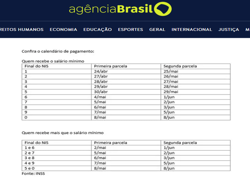 O benefício extra será pago em duas parcelas. A primeira será paga nesta sexta até 8 de maio. A segunda vai de 25 de maio a 8 de junho. As datas são definidas com base no dígito final do Número de Inscrição Social (NIS) e com base na renda do beneficiário. Quem ganha apenas o salário mínimo começa a receber antes de quem recebe mais que o mínimo.